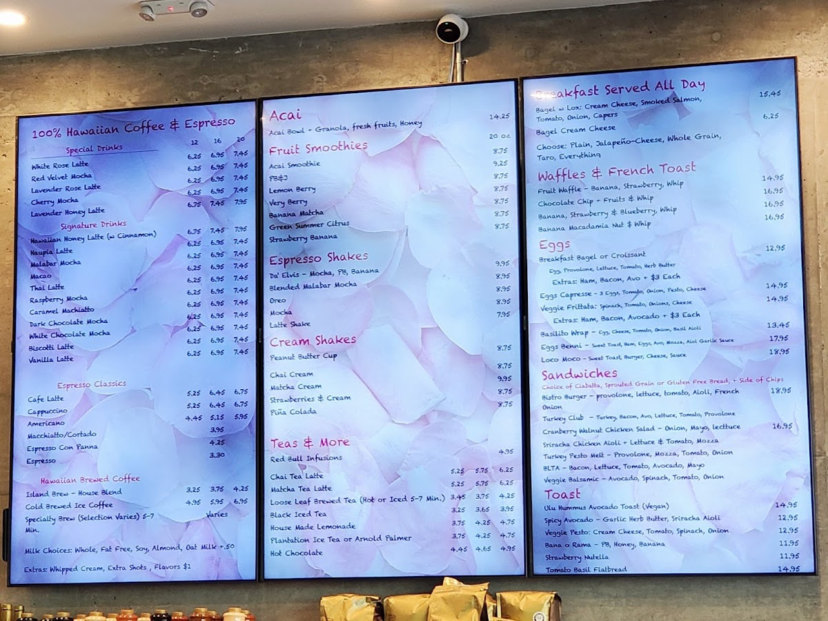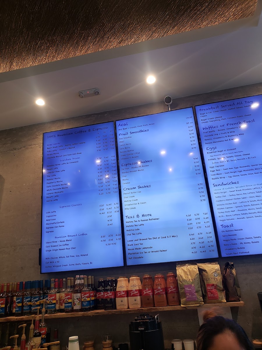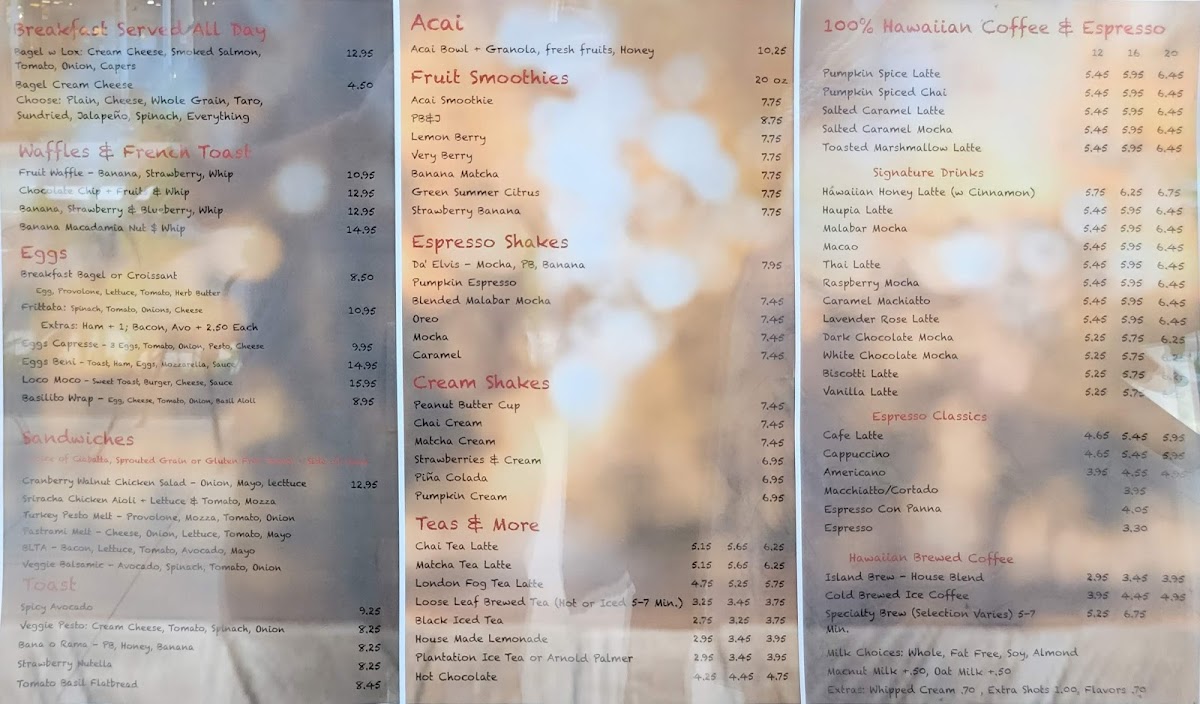 This menu is structured to accommodate quick service with an emphasis on coffee and light meals, making it appropriate for visitors looking for breakfast, a mid-day snack, or a relaxed coffee break. Customers can expect options that combine traditional cafe fare with local Hawaiian influences, such as Hawaiian honey latte and island-grown coffee beans.