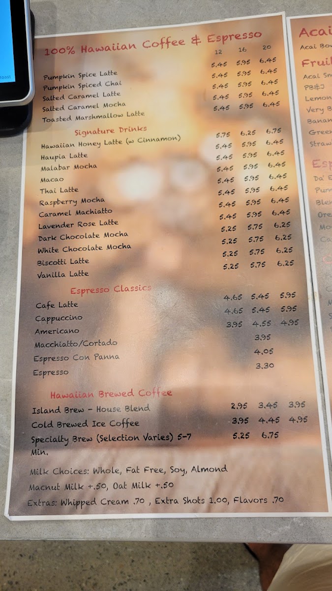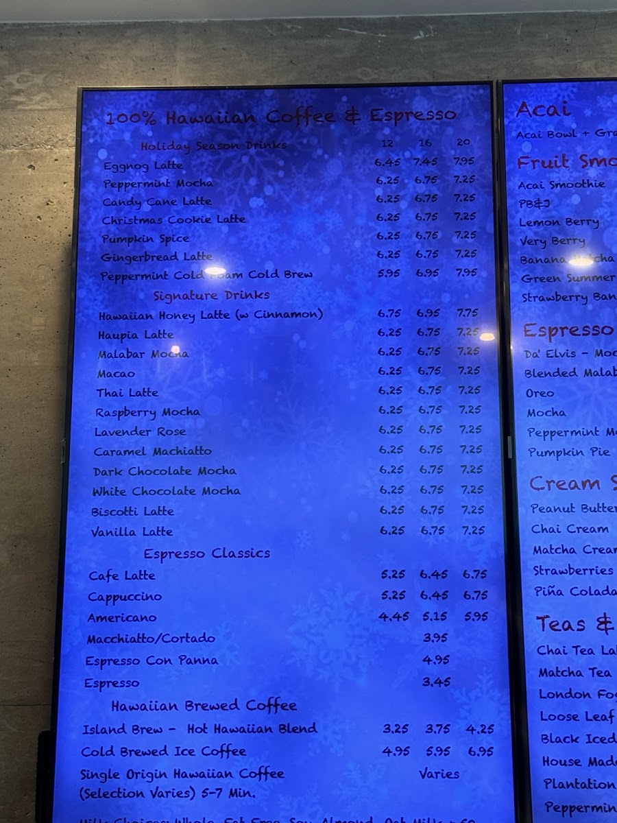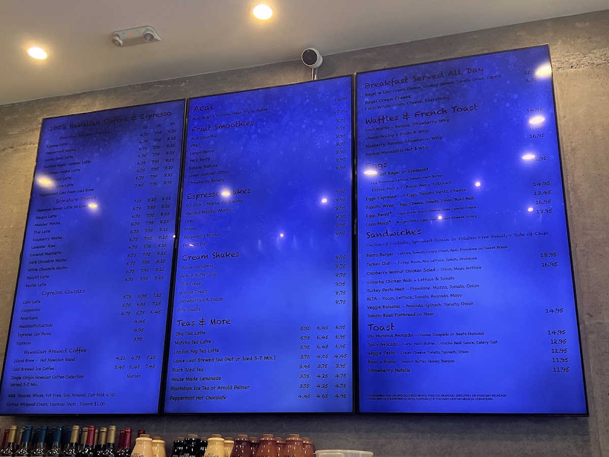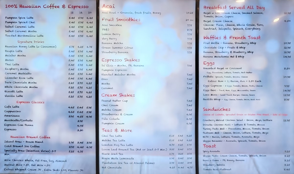 This menu is structured to accommodate quick service with an emphasis on coffee and light meals, making it appropriate for visitors looking for breakfast, a mid-day snack, or a relaxed coffee break. Customers can expect options that combine traditional cafe fare with local Hawaiian influences, such as Hawaiian honey latte and island-grown coffee beans.