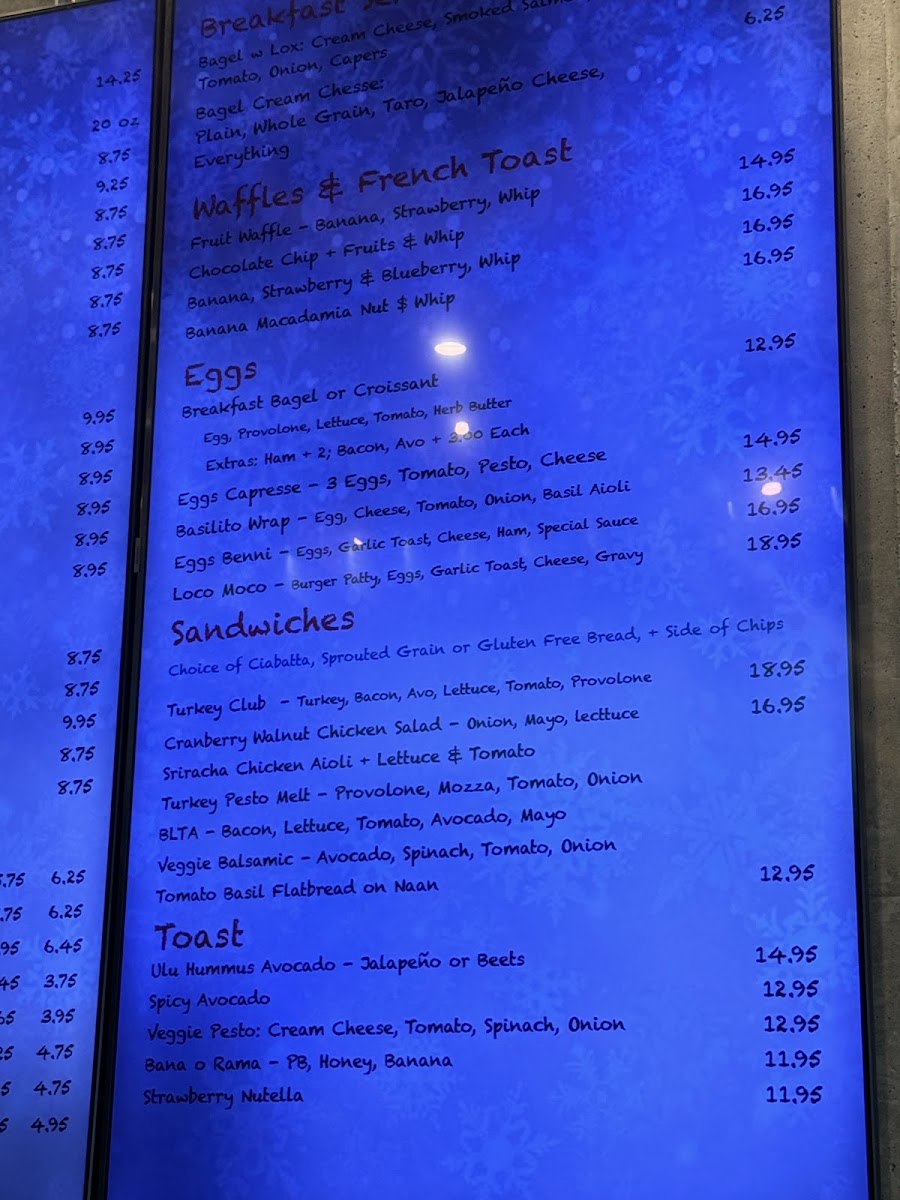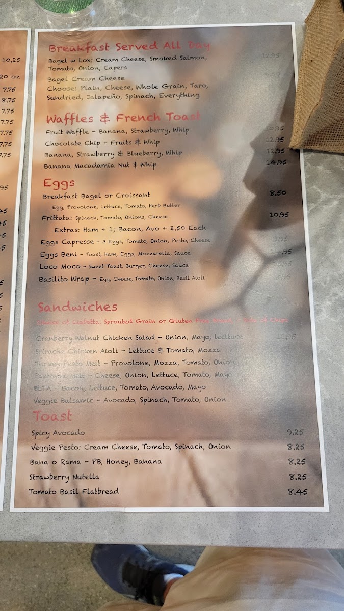 Food items are organized mainly around breakfast and light lunch options. The breakfast selections include items such as bagels with cream cheese and smoked salmon, breakfast sandwiches with egg and provolone, eggs caprese topped with cheese and pesto, as well as French toast and waffles made with banana macadamia nuts. For those seeking sandwiches and wraps, the menu offers choices like BLTA with Maui style chips and other sandwich varieties suitable for casual dining.
